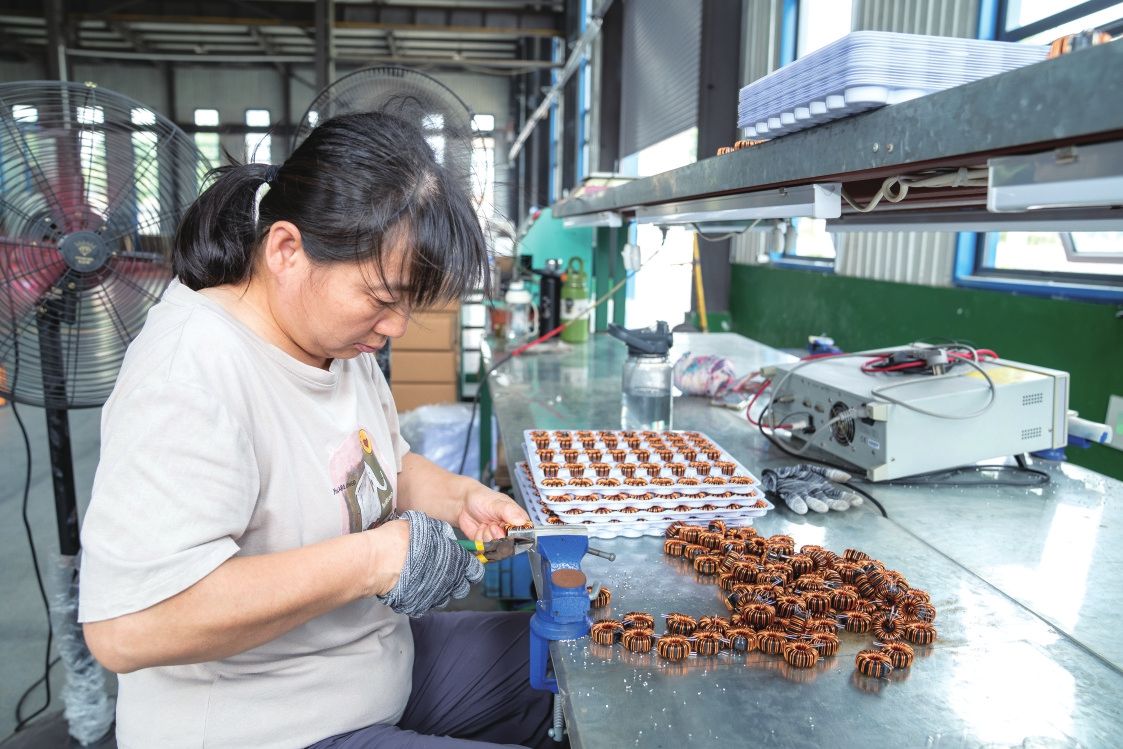 在山東匯嘉磁電科技有限公司生產(chǎn)車間,工人正在生產(chǎn)軟磁粉芯,產(chǎn)品主要用于光伏逆變器、充電樁、新能源汽車等領(lǐng)域。 記者姜偉攝